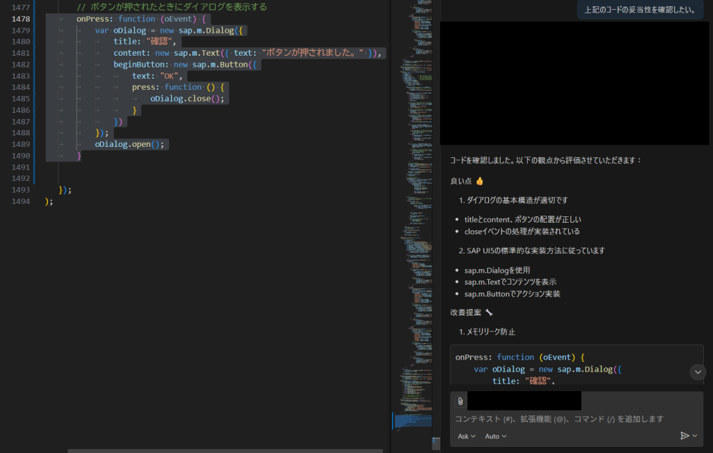 - コードレビューの補助:sap.m.Tableやsap.m.Dialogなど、Fioriガイドラインに沿ったUI部品を提案してくれるため、提案されたコードをベースに議論がしやすくなる