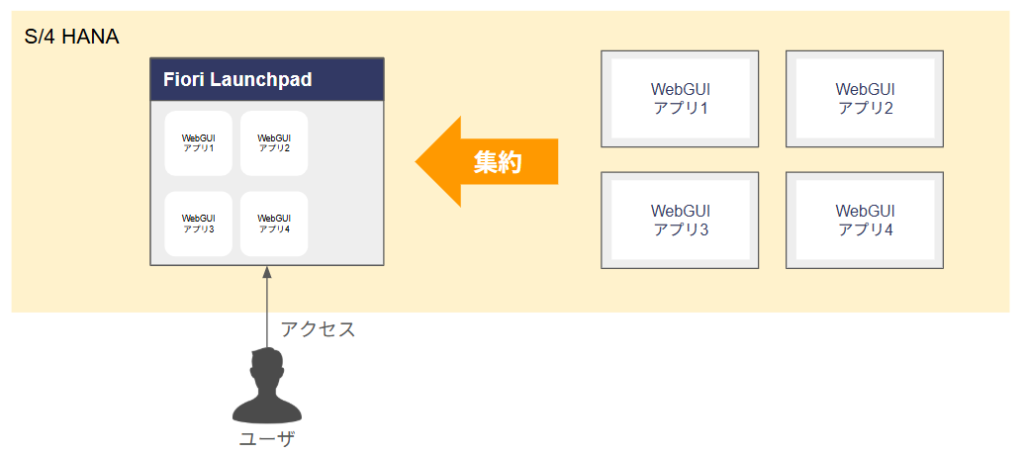 Fiori Launchpad でアプリへのアクセスを一元化してしまえば、例えば Fiori アプリからWebGUIアプリを呼び出すといった連携も可能になり、アクセス方法の幅が広がるほか、パフォーマンスやUI/UXの向上も見込めますね。