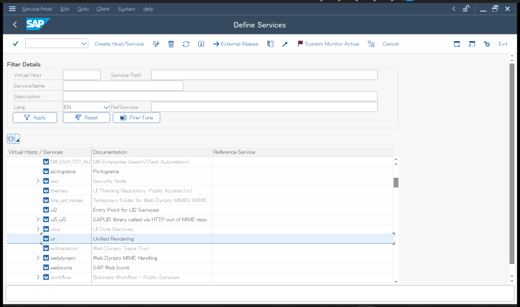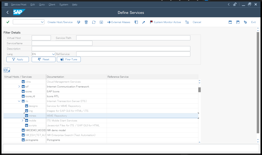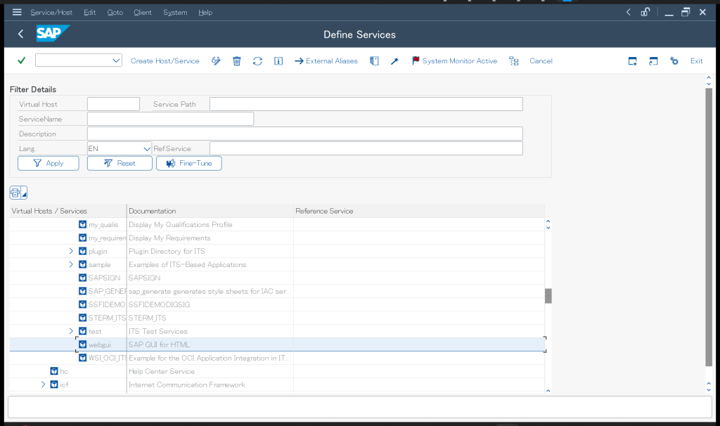 トランザクションコード『SICF』でそれぞれのサービスパスまで移動し、サービスを有効化してください。