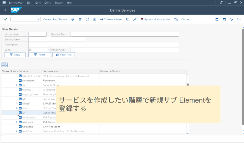 続いて作成したABAPクラスを外部から呼び出せるように、トランザクション「SICF」でサービスを公開します。