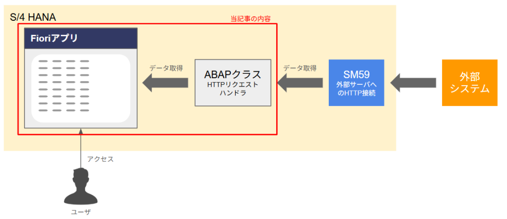 ODataサービスとしてのデータ公開が難しい、または外部REST APIのデータをFioriアプリで取得・利用したい…といったケースはないでしょうか。私は普段BTPでのフロントエンド開発を担当しており、外部サービスとの連携は Approuter と Destination で行っていますが、同じようなことをオンプレミスでできないかを検証する機会がありました。要件としては、S/4 HANA のSM59トランザクションを使って外部APIに接続し、取得したデータを最終的にFioriアプリに表示したいといったものです。本記事では、この課題を解決するため、ABAPでHTTPリクエストハンドラを構築し、Fioriアプリケーションから呼び出す手順を解説します。