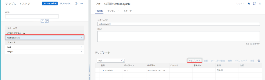 4.作成したフォームを選択し、テンプレート欄の「アップロード」を押下する。