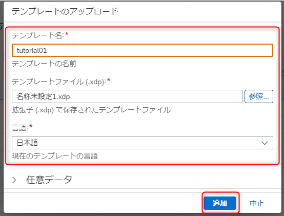 ・テンプレートファイル:作成済みの帳票テンプレートファイル(XDPファイル)