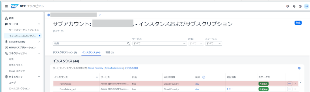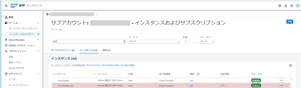 2-3.「インスタンスおよびサブスクリプション」を開き、2-2で作成したインスタンスの「サービスキー作成」を行う。