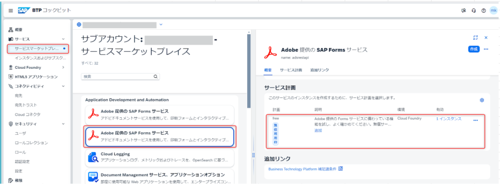 1-1.BTPにてサブアカウントにサインインし、「サービスマーケットプレイス」を開く。