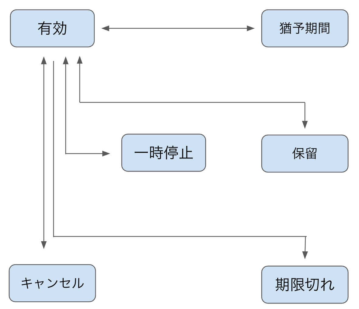 以下の図は、サブスクリプションが「有効」な状態から他のステータスへどう遷移するかを示したものです。実際には各ステータスからの遷移が存在するため、全体像はこれよりもはるかに複雑になります。詳細については以下の公式サイトの遷移図を参照ください。