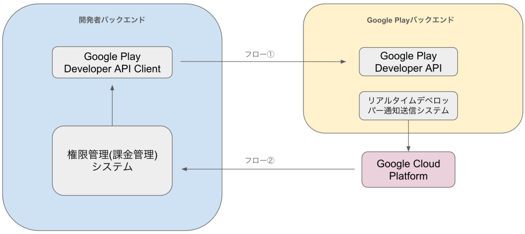 フロー②(リアルタイム通知:Push型): Google Playバックエンド → 開発者バックエンド