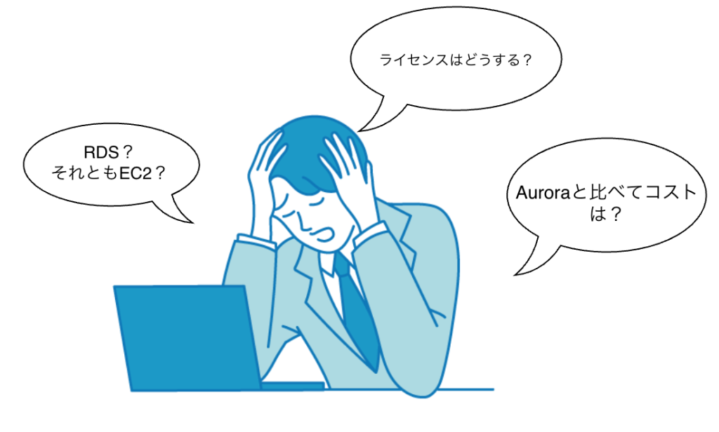 ライセンスはどうするのか、RDSでいくのか、EC2にインストールするのか、コスト感はどうなるのか……。