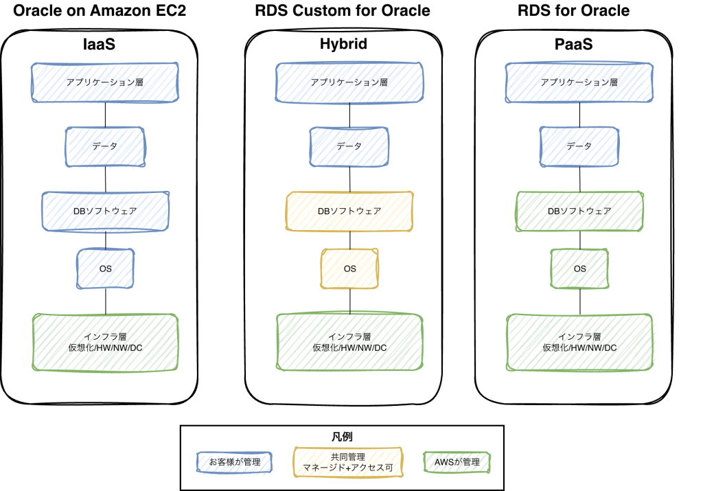 Amazon RDS Custom for Oracleはその中間に位置するサービスでOSレイヤへのrootアクセスが可能なため標準RDSでは要件を満たせなくともマネージドの恩恵を受けることができる場合があります。オンプレからの移行時に利用することが多いかと思います。