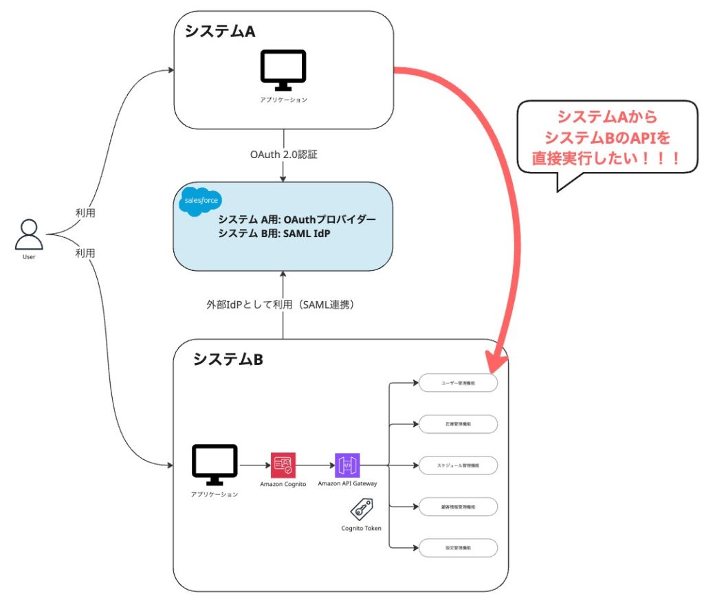 今回の最終的な目的は図にもある通り、システムAから直接システムBのAWS環境内のAPIを実行するというものです。そのためには、外部OAuth(Salesforce)で既に認証済みのユーザーに対して、どのようにCognitoトークンを発行(トークン交換)するか、という点が主な課題となります。