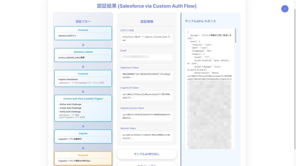 Salesforceトークン取得後、「カスタム認証フロー実行」ボタンを押すと下記のフローでCognitoトークンが返されます。