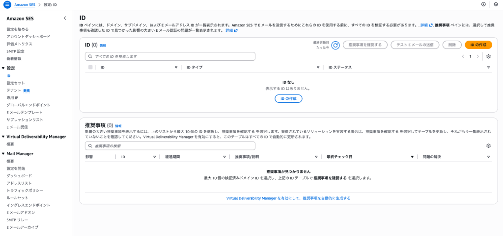 右下の「IDの作成」ボタンを押下すると、Cognitoのメール送信で利用するSESのIDが作成されます。
