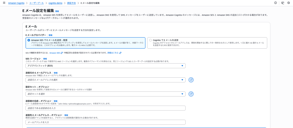 最後にCognitoのページで、作成したIDを送信元メールアドレスとして設定しましょう。