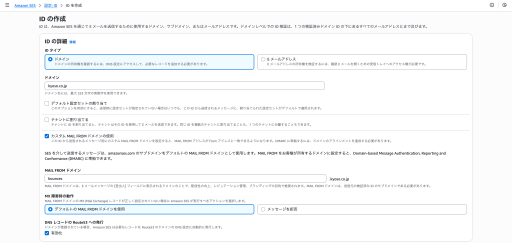 - カスタム MAIL FROM ドメインの使用: チェックボックスをON