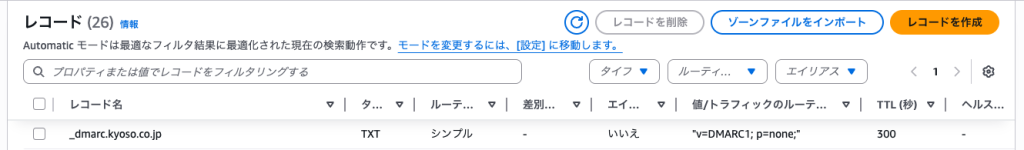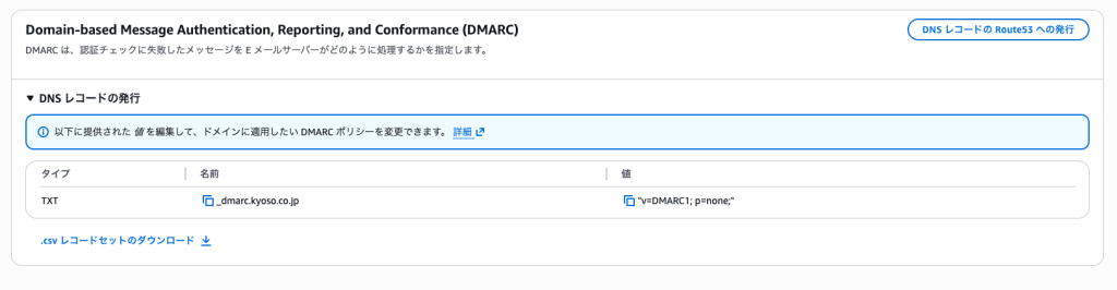 右上の「DNSレコードのRoute53への発行」ボタンを押下すると、自動でRoute 53に設定されます。