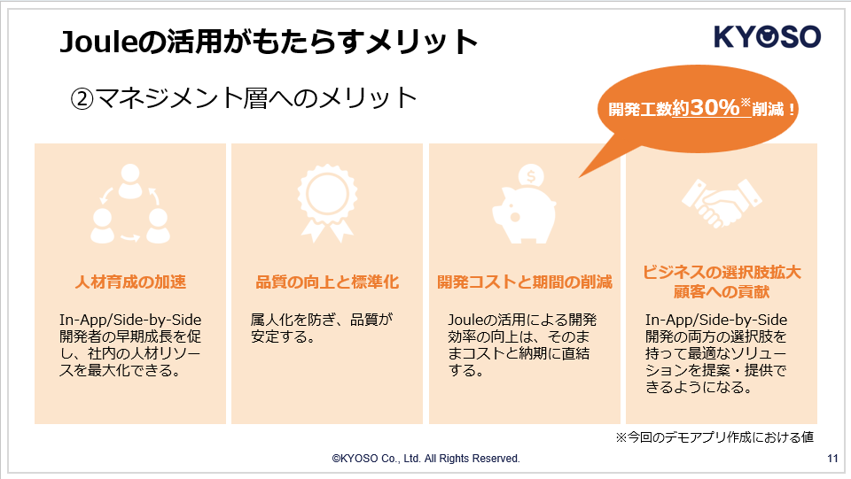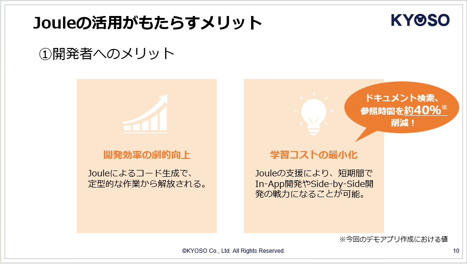 SAPのAIツール「Joule」は、S/4HANA CloudでのIn-App開発と、SAP Business Technology Platform (SAP BTP)でのSide-by-Side開発の両方で利用可能です。今回はそのJouleを利用した実際の開発風景をお見せしながら、開発の効率化とビジネス拡大につながる具体的な活用例をご紹介しました。