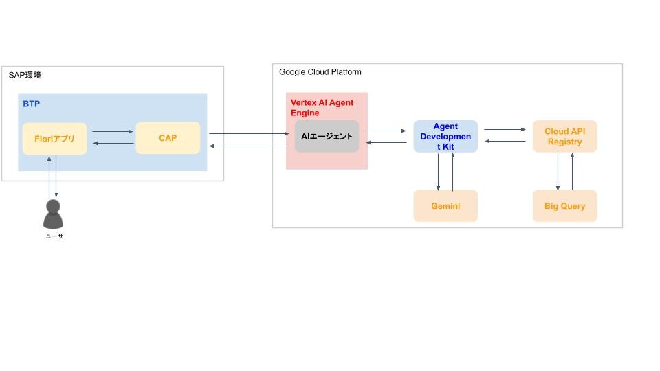 | SAP CAP | Fiori と Google Cloud の橋渡し役。ユーザーからのリクエストをVertex AIにHTTPで中継 |
