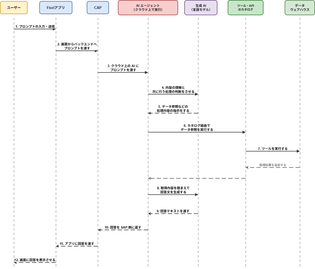 ユーザーが画面に入力したプロンプトは、まず Fiori アプリから SAP のバックエンド(CAP)へ渡り、そこからクラウド上で動く AI エージェントに送られます。